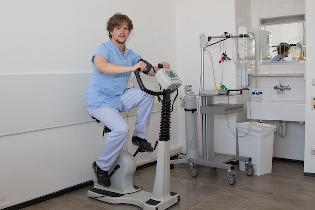 Ihnen werden zunächst mehrere Elektroden auf die Brust, die Arme und Beine geklebt und eine Blutdruckmanschette am Oberarm angelegt. Anschließend werden Sie sich auf einem speziellen Fahrrad, dem Fahrradergometer betätigen.